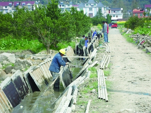杜泽镇抓住当前有利时机,掀起春修水利热潮,确保春耕供水。图为3月26日上午,施工人员正在灌渠里立模,准备浇筑。 杜忠德/摄