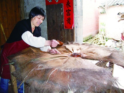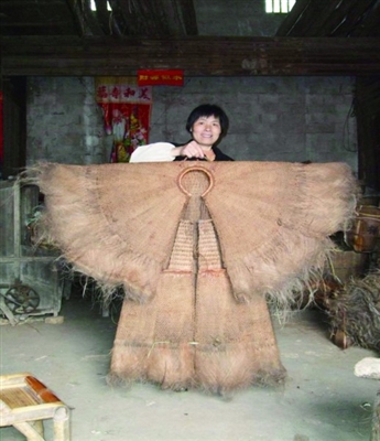 棕蓑衣主要用来遮风挡雨,具有经久耐用、保暖、透气的特点。蓑衣的上装似大坎肩,下装则像前面开口的裙子。其每个环节皆用纯手工制作,且工艺考究,有10多道工序。一件蓑衣一般需8—12斤棕片才能制成。制作蓑衣时,要将棕片一片一片有序地接在一起,然后一针一针地细缝。一件可遮风挡雨的蓑衣,凝聚着制作者3—4天的劳动心血。