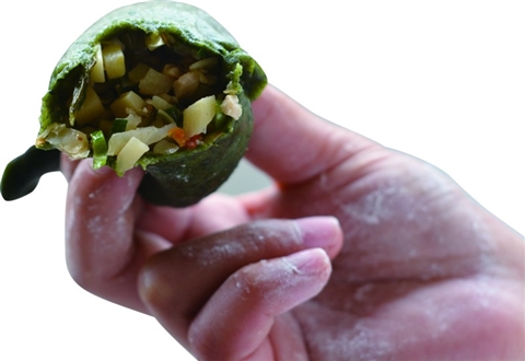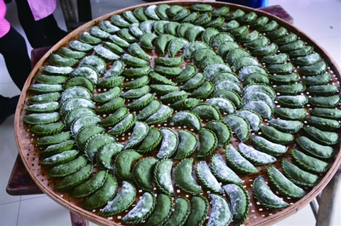“将粉团揉透,拧成一个个小团,用压板压得薄薄的,然后用碗往面皮上一扣压,沿着碗边去掉多余的面皮,留下的是一张圆圆的皮子。往皮子里装满馅,对折,巧手的妇女们就在这饺子型的馃,打上花边一样的褶子,一个碧绿的清明馃就做好了。”村民曾菊仙向我们新出炉的清明粿。