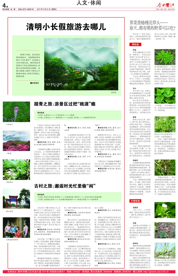 清明小长假,是去好山好水的地方,为疲惫的身体做个“天然SPA”?还是踏上古朴古韵之旅,缅怀思念寻找春天?亦或去探险峡谷,体验大自然的惊险与刺激。本期小编精心搜罗了周边几个踏青出游地,让你不负春光,轻装出游。