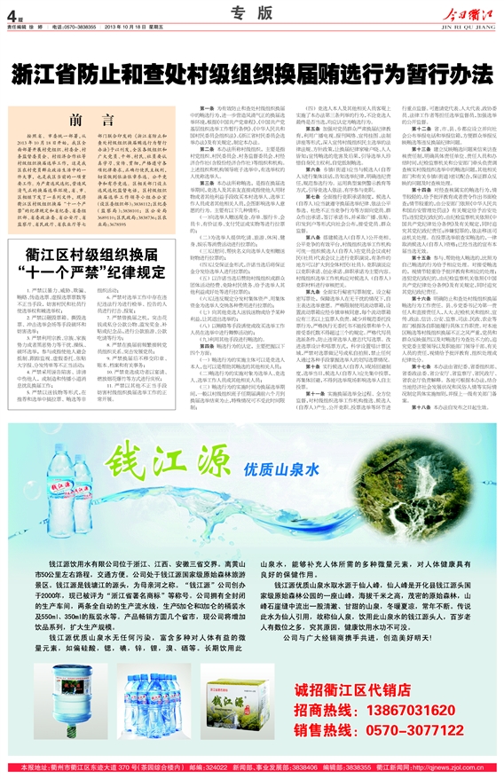 按照省、市委统一部署,从2013年10月18日开始,我区全面部署开展村党组织、村委会、村务监督委员会、村经济合作社等村级组织换届选举工作,这是我区农村党员群众政治生活中的一件大事,也是我区当前的一项重要工作。为严肃选风选纪,营造风清气正的换届选举环境,省、市、区相继下发了一系列文件,现将衢江区村级组织换届“十一个严禁”的纪律规定和省纪委、省委组织部、省委政法委、省公安厅、省监察厅、省民政厅、省农业厅等七部门联合印发的《浙江省防止和查处村级组织换届贿选行为暂行办法》予以刊发,全区各级组织和广大党员、干部、村民、社员要认真学习、宣传、贯彻,严格遵守各项纪律要求,正确行使民主权利,切实做到依法依章参选、公平竞争和有序竞选。区相关部门设立选风选纪监督电话,区村级组织换届选举工作领导小组办公室(设区委组织部):3838112;区纪委(监察局):3838101; 区公安局3689110;区民政局:3838736;区农业局:3678595
