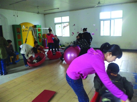 现在,特训中心共有老师8位,他们中有学校刚出来的,也有实践经验丰富的,但有爱心、有责任心是他们共同的特点。从早到晚,他们一天天重复着对重度智力发育障碍儿童的生活自理能力训练、感觉统合训练、精细动作训练、手眼协调训练、语言训练、认知能力训练,对于肢体发育障碍儿童的柔韧性训练、按摩、腰腹部力量训练、感觉统合训练、站立和行走训练等,不厌其烦、循序渐进。