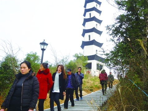 杜泽镇巽峰塔恢复重建工程在去年完工后,健身休闲公园等一些配套设施建设也在今年春节前全部竣工,新建成的巽峰塔景点成了人们关注和游玩的热点。图为2月19日下午,游客们在游览参观巽峰塔景点。