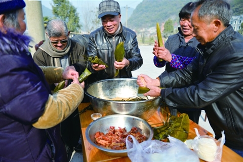 “我6点多就开始忙活了,这儿一共10斤面,馅儿是早上刚弄的,肉是昨天从集市里买的,有5斤半吧,白菜用了8棵,是早上刚剁好的。馅儿里还加了一斤花生油!你闻闻,香吧?”村民刘爱珍一边笑着对记者说,一边招呼着老人们,“十五斤糯米昨天晚上就浸下去了,今天早上洗好粽叶、切好猪肉,准备好大锅,包好就下锅,趁热吃!”