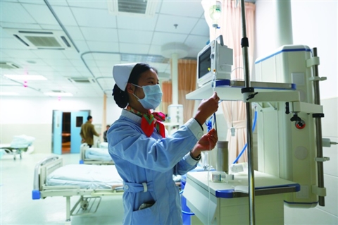春节期间,市第二人民医院的医护人员放弃与家人团聚的时间,坚守在岗位上,为群众送去温暖。图为护士吴艮平在除夕当天值班,一刻都不曾离开岗位。 杨丹萍/摄