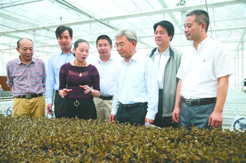 衢州市三易易生态农业科技有限公司高科技园区核心区面积6000亩,布局“两园一中心”:科技创新创业园、高端农产品示范园和种子种苗中心,计划总投资2.78亿元。张桃林一行来到三易易金线莲炼苗区,几位工人正在紧张有序忙碌,从培养室挑选出适合种植的瓶苗在这大棚里炼苗,“目前炼苗区有960平方米,可以存放6万瓶。”工作人员介绍。张桃林仔细查看长势情况,详细了解炼苗的光照、湿度等要求后高兴地说:“高科技,这是现代农业发展的支撑。”来到金线莲主培中心,中心内设有整个园区互联网控制中心,由配制室、接种室、培养室、炼苗区和种植区等四部分组成。张桃林高兴地指出,科技兴农让“生物不累、土地不累、人不累”,要继续加大科技力度,推动农业高效农民增收。