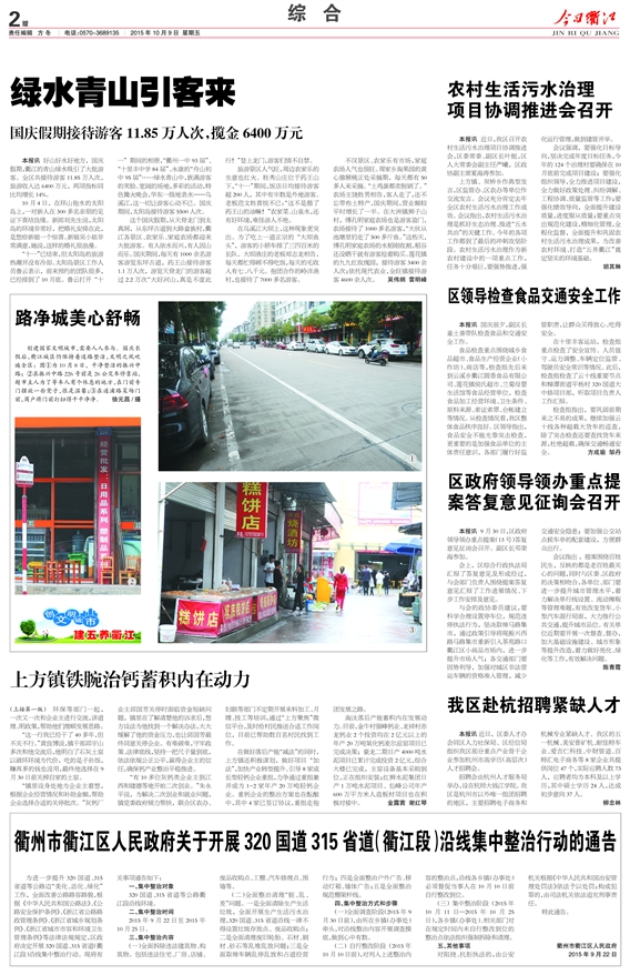 本报讯 好山好水好地方,国庆假期,衢江的青山绿水吸引了大批游客。全区共接待游客11.85万人次,旅游收入达6400万元,两项指标同比均增长14%。