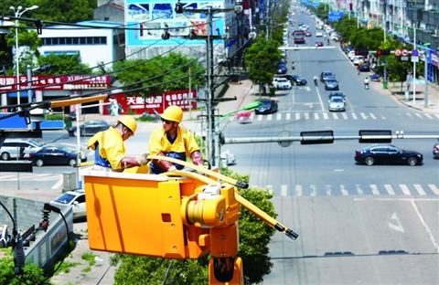 7月6日,国网衢州供电公司配电运检室工作人员冒着高温,在振兴中路8020线#30杆开展带电作业,消除线路缺陷,为接下来的电网迎峰度夏工作做好准备。